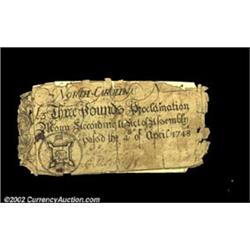 North Carolina April 4, 1748 $3 Fine. All the text, as well as the vignette of Fort Johnson, are perfectly clear and legible. The note has been contemporarily backed and is held in part to that backing by a colonial-era straight pin. The edges are considerably frayed, but this does not affect the text. Important notice: We expect to be auctioning lots at the rate of 200-250 per hour. Sometimes eBay Premier live bid software cannot keep up with that pace, so we strongly recommend that you place a realistic proxy bid now as insurance to avoid disappointment. Also please note that all Heritage/CAA lots purchased through eBay Premier carry a 20% Buyer's Premium. Please make sure you read the Terms and Conditions.