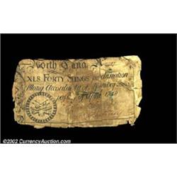 North Carolina April 4, 1748 40s Fine. Contemporarily backed and tied to that backing by two colonial-era pins. The backing has a number of contemporary endorsements on it. The corners are rounded and the edges a bit frayed, bit the drum-cannon-and-flag vignette is cleanly printed, whole and perfect. This is an important note, as even in this condition, it's far better than most. It's #1907 out of 2,000 printed, 254 years ago. Important notice: We expect to be auctioning lots at the rate of 200-250 per hour. Sometimes eBay Premier live bid software cannot keep up with that pace, so we strongly recommend that you place a realistic proxy bid now as insurance to avoid disappointment. Also please note that all Heritage/CAA lots purchased through eBay Premier carry a 20% Buyer's Premium. Please make sure you read the Terms and Conditions.
