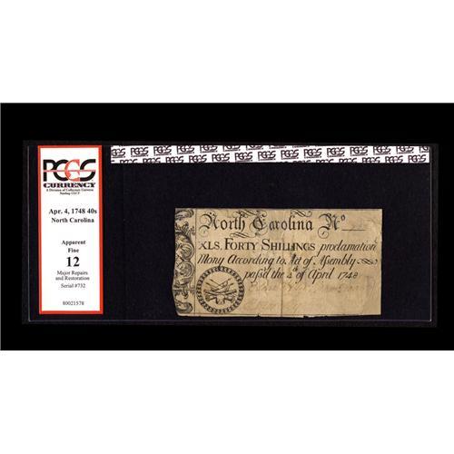<B>North Carolina April 4, 1748 40s PCGS Fine 12.</B></I> Red Holdered for "Major Repairs and Restorations" but the note has the visual appearance of a $600+ item.