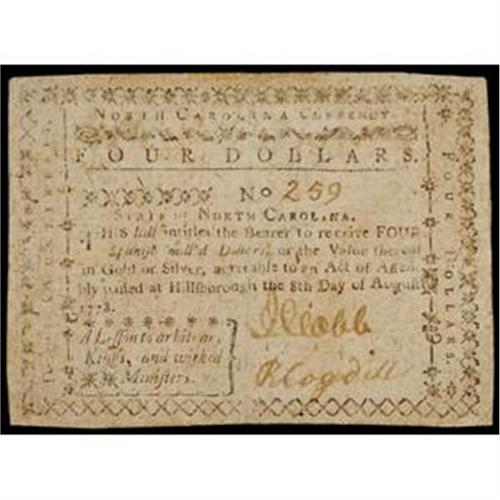 North Carolina, August 8, 1778, $4, Crisp About Uncirculated.