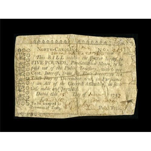 <B>North Carolina December 15, 1757 £5 Very Fine.</B></I> Contemporarily backed but in far better condition than what one would expect for this extremely rare issue. This is the variety with the word "Payment" not hyphenated. The signatures are perfect, and every word of the text can be clearly read. <BR><BR><BR><b>Shipping:</b> Coins & Currency (<a target="_blank" href="http://www.heritageauctions.com/common/shipping.php">view shipping information</a>)