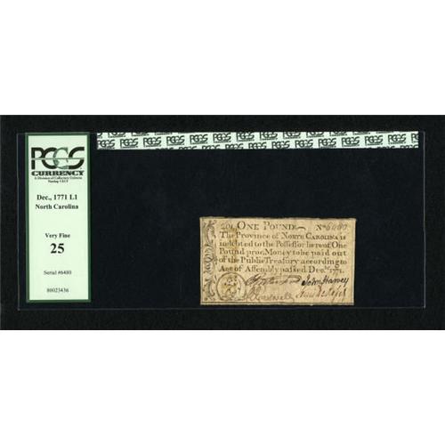 <B>North Carolina December, 1771 £1 PCGS Very Fine 25.</B></I> The vignette is of the constellation Ursa Minor. All four signatures are dark and legible.<BR><BR><b>Shipping:</b> Coins & Currency (<a target="_blank" href="http://www.heritageauctions.com/common/shipping.php">view shipping information</a>)