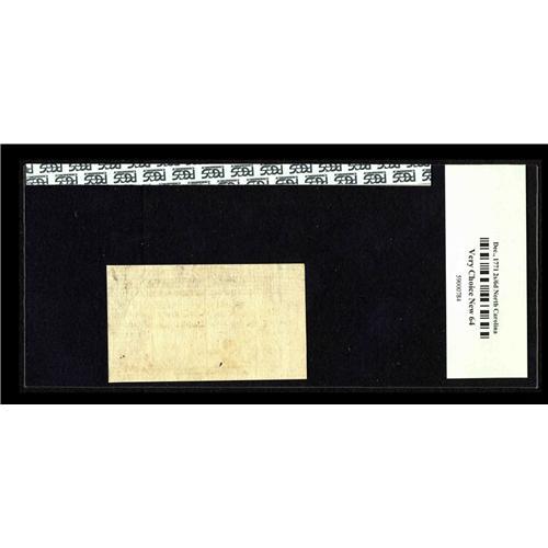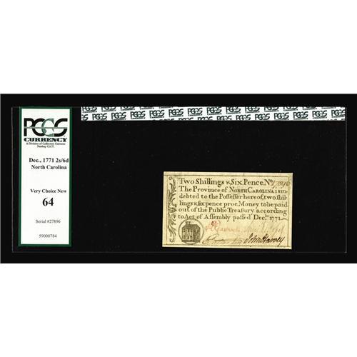 <B>North Carolina December, 1771 2s/6d PCGS Very Choice New 64.</B></I> A beautifully margined, well-signed piece that certainly appears as though a higher grade would have been in order.