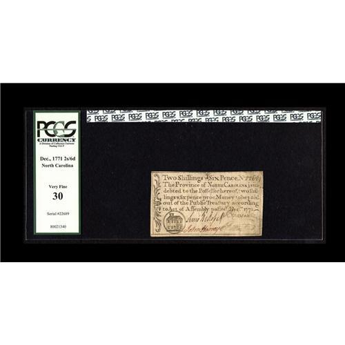 <B>North Carolina December, 1771 2s/6d PCGS Very Fine 30.</B></I> This note was once mounted in an old album as the two right-hand corners will attest to. Only a few folds are noticed on this note that has a miniscule edge nick.