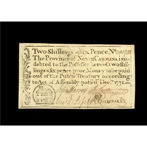 <B>North Carolina December, 1771 2s/6d Very Choice New.</B></I> Simply another original house note with wonderful surfaces and excellent margins.