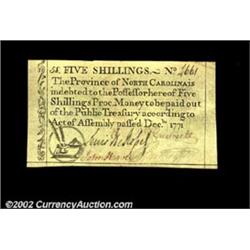 North Carolina December 1771 5s About New. Utterly problem-free, with a strong vignette and four strong signatures. A lovely, lightly circulated example that would please any collector. Important notice: We expect to be auctioning lots at the rate of 200-250 per hour. Sometimes eBay Premier live bid software cannot keep up with that pace, so we strongly recommend that you place a realistic proxy bid now as insurance to avoid disappointment. Also please note that all Heritage/CAA lots purchased through eBay Premier carry a 20% Buyer's Premium. Please make sure you read the Terms and Conditions.