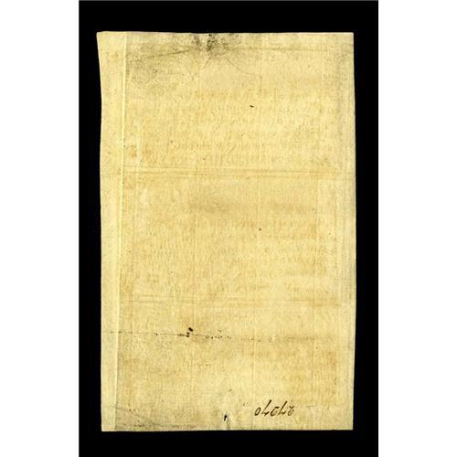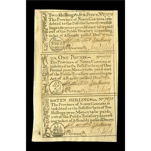 <B>North Carolina December, 1771 Strip of Three Very Choice New.</B></I> The strip has a 2s/6d note at the top, followed by the L1, followed by the 10s ship. The top note has the normal needle-hole and a pen notation on the back. The bottom two notes are pristine.