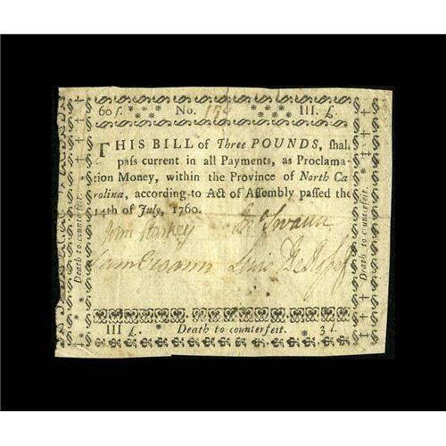 North Carolina July 14, 1760 $3 Very Fine. There is a