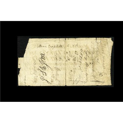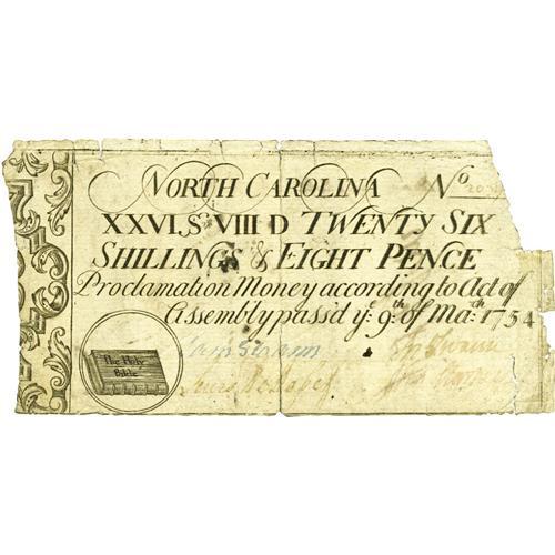 <B>North Carolina March 9, 1754 26s/8d Very Fine.</B></I> There are a few splits along the edges and the upper-right corner tip is missing, but it does not affect the serial number or any of the design. This is a remarkable grade for this early note that has a strong vignette of the Bible. A large portion of the indent is also present.
