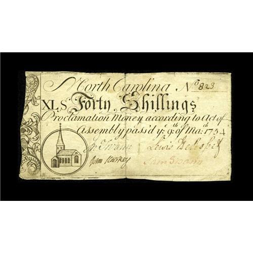 <B>North Carolina March 9, 1754 40s Very Fine.</B></I> There is an approximate half inch edge split noticed on this note that also has pinholes. The left end indent is far larger than what is normally seen and all four signatures are legible. The vignette of a church and steeple was copied from Christ Church at Newbern, North Carolina.<BR><BR><b>Shipping:</b> Coin/Currency (<a target="_blank" href="http://www.heritageauctions.com/common/shipping.php">view shipping information</a>)