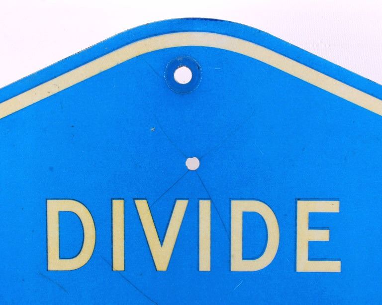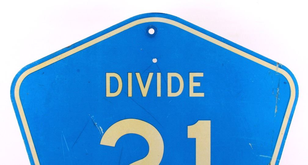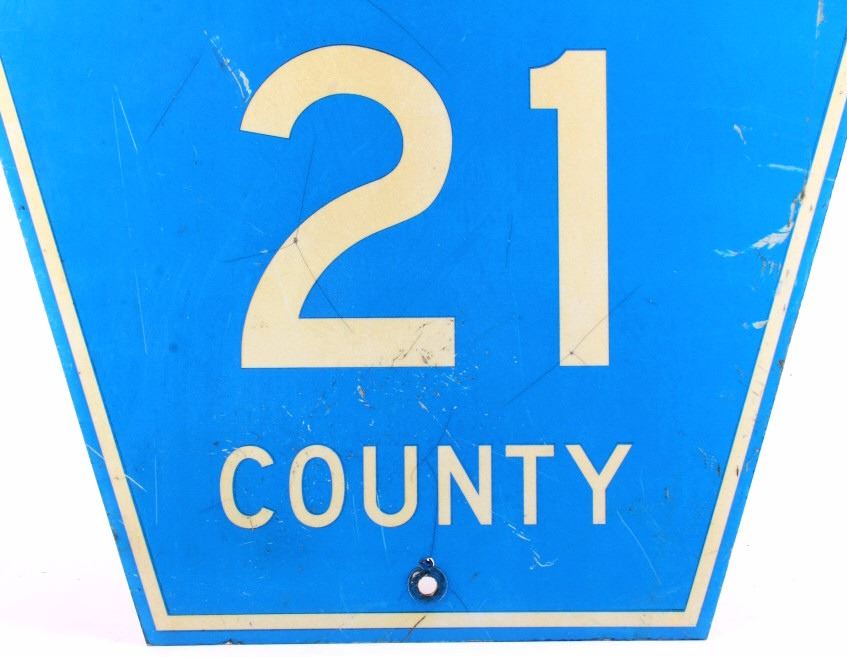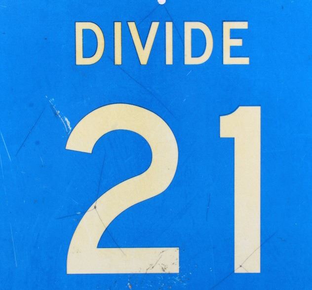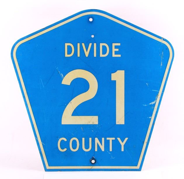 This is an original Divide County highway sign from North Dakota. The sign shows the North Dakota highway shield and reads "Divide County 21". The sign is in good overall condition with some wear as shown. The sign measures 24" x 24".