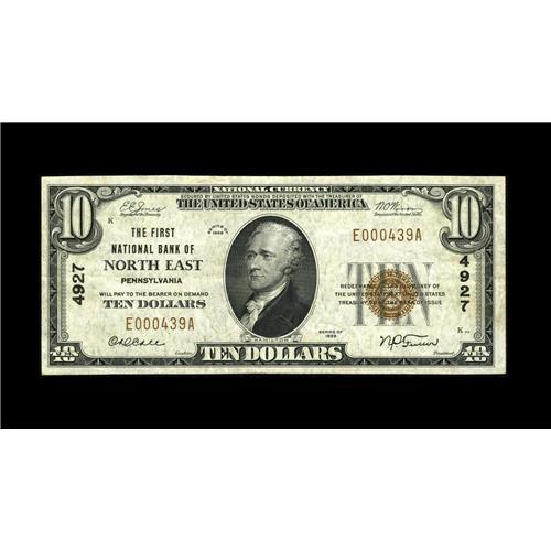 <B>North East, PA</B></I> - $10 1929 Ty. 1 <B>The First NB</B></I> Ch. # 4927<BR>Despite what its name may imply, this community is actually located in Erie County in the Northwest corner of the state. We sold another $10 from here in this same <B>Extremely Fine</B></I> grade at our Florida United Numismatists auction for $517.50. This example will sell in that vicinity, also.<BR><BR><b>Shipping:</b> Coin/Currency (<a target="_blank" href="http://www.heritageauctions.com/common/shipping.php">view shipping information</a>)
