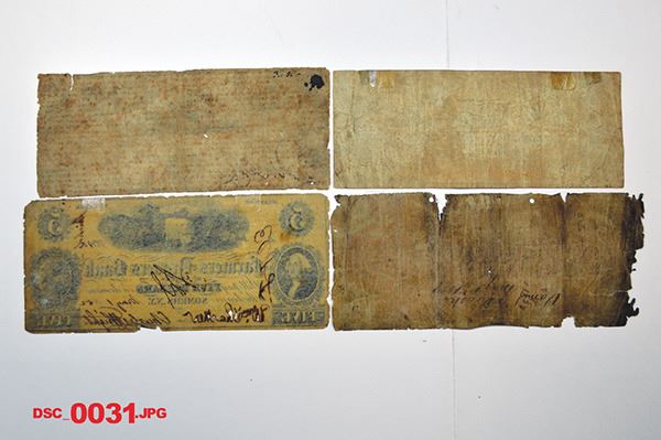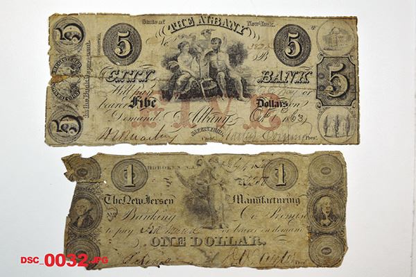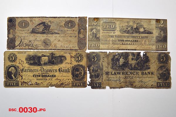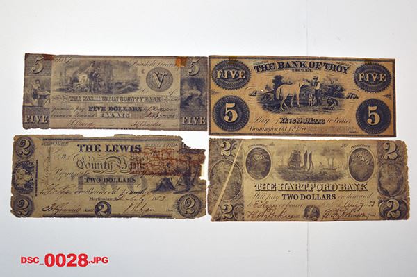 Lot of 10 notes, includes the following issues; Martinsburgh, NY. Lewis County Bank $2; Bank of Troy (Troy NY), $5, Payable at Bennington, VT ; Somers, NY. Farmers and Drovers Bank, $5; Ogdensburgh, NY. St.Lawrence Bank, $5; Albany City Bank, $5; CT. Hartford Bank, $2 with Internal pre-printing fold; New Haven, CT. Eagle Bank, $1; NJ Mfg, $1; Maine. The Washington Bank, $2 and $5. Condition mixed between good with faults to Fine. Sold "As is", no returns accepted.
