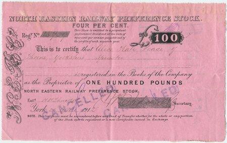 1912, 100 Pounds Preferred Stock. Four Per Cent stock certificate. Black on Purple paper.