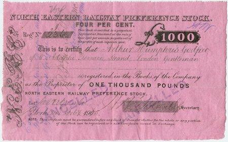 1905, 1,000 Pounds Preferred Stock Four Percent stock certificate. Black on purple paper.