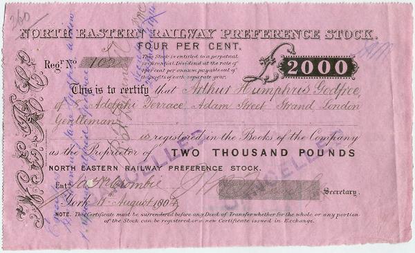 1904, 2000 Pounds Preferred Stock. Four Per Cent stock certificate. Black on purple paper.