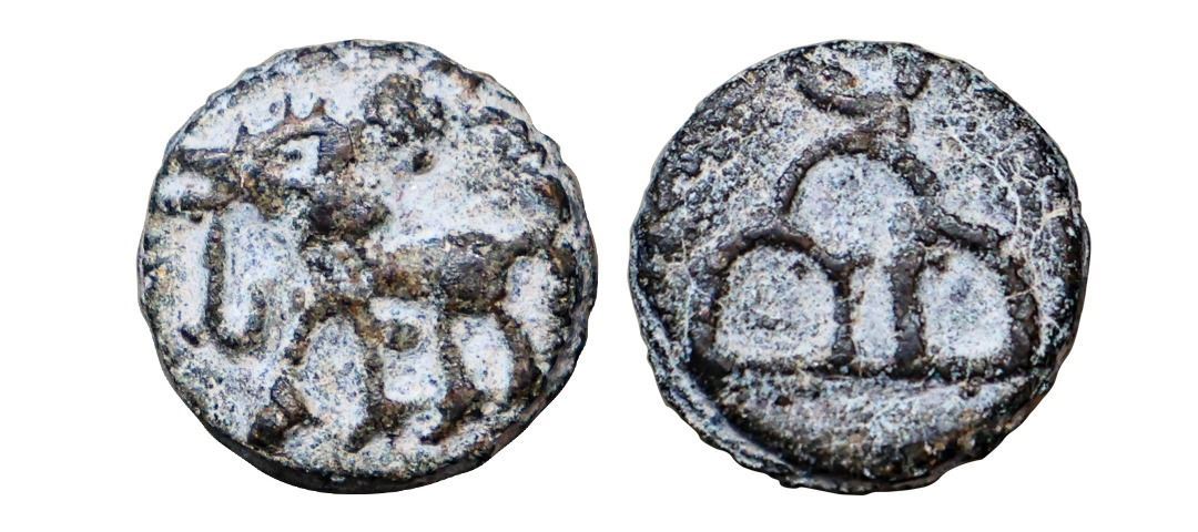 North India, Generally Assigned to Sunga Dynasty (c. 1st Century BC), Uninscribed, Cast Copper Unit, 2.18 gms, Obverse: Elephant to left, Reverse: Three arch hill (Chaitya) surmounted by a crescent, Pieper # 323, about very fine, scarce.