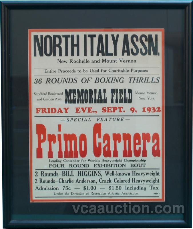 "North Italy Assn" Boxing Broadside, Friday Eve., Sept. 9, 1932 Memorial Field Mount Vernon, New York. Under the direction of Recreation Athletic Association, in good condition in frame - 17" x 21"