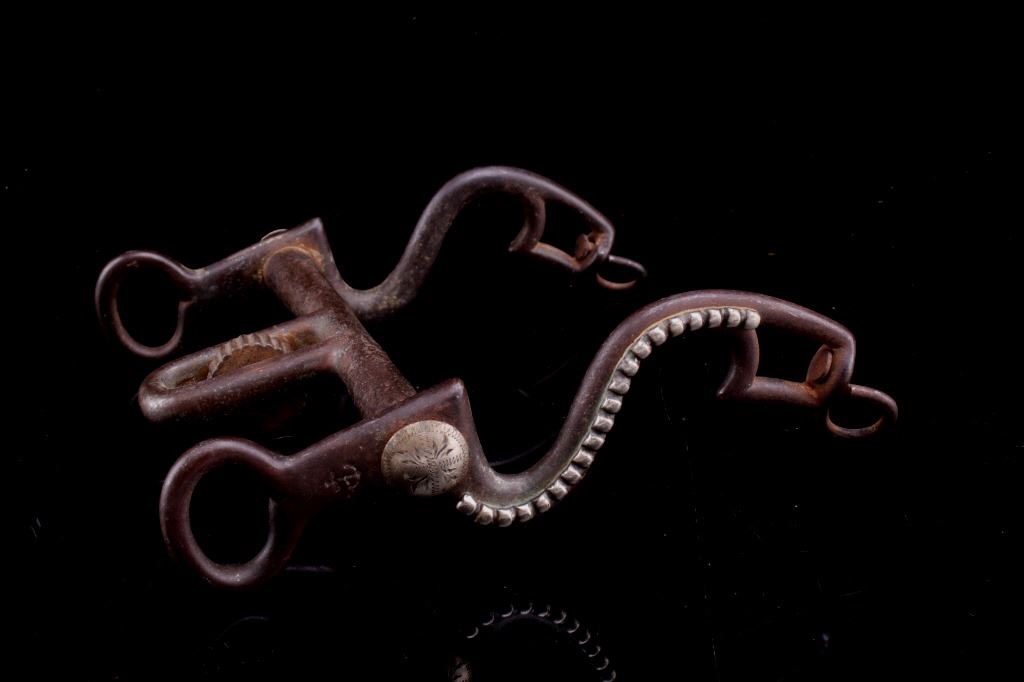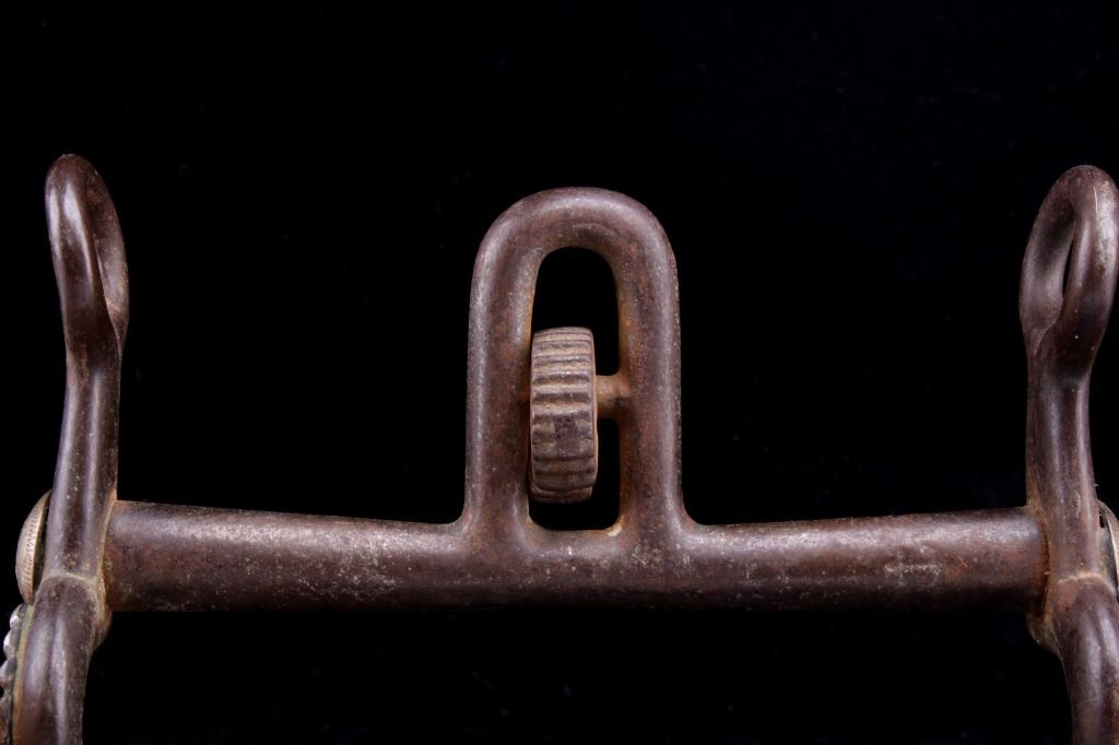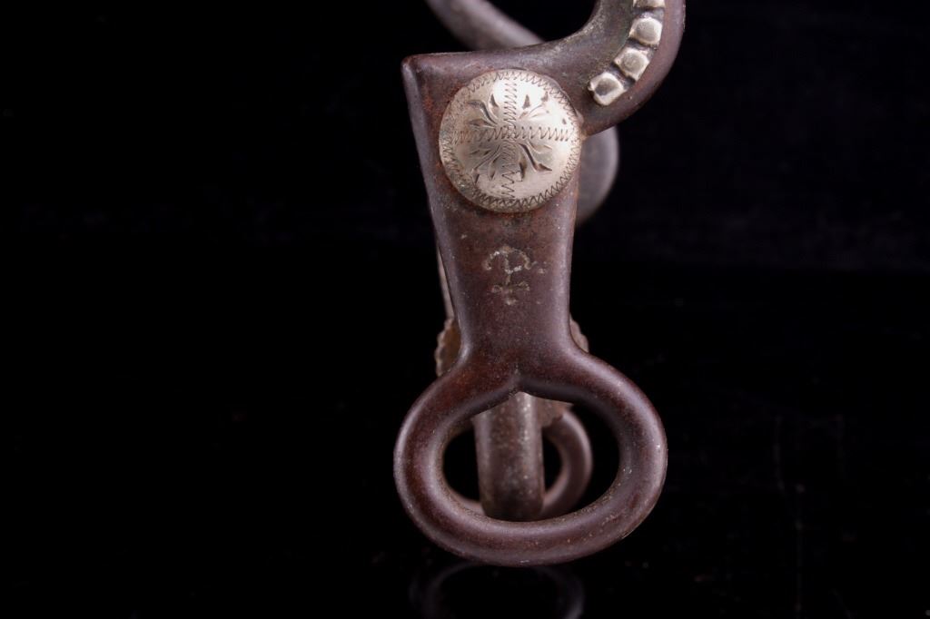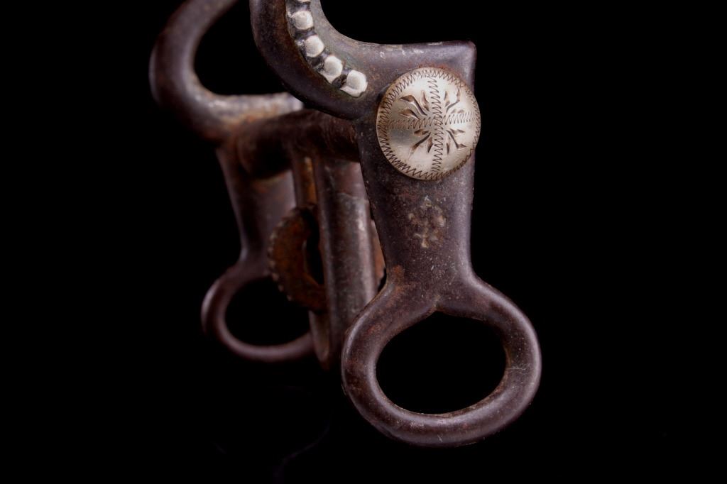 Featured in this lot is this North & Judd silver mounted high port bridle bit, circa 1920's. The bit shows a high port with a cricket in the center, a unique silver mounted "S" shank design with slobber strap connectors, and a wonderful silver mounted button at the top of the shank of the bit. North and Judd was a very large company based in Connecticut that produced saddlery and other hardware, from bells to buckles. The firm employed hundreds of workers and eventually would buy out the Buermann Company in 1926. This is why you will often see many Buermann patterns with the North & Judd Anchor Brand, as many popular Buermann patterns continued to be sold after North and Judd acquired them. The North and Judd stamp on these pieces dates them to after 1926; they are less valuable than similar Buermann pieces. The condition of this bridle bit is good, with oxidation and patina consistent with the age of bit. The measurements of this bridle bit are 6 1/4" x 6" x 1 1/2".