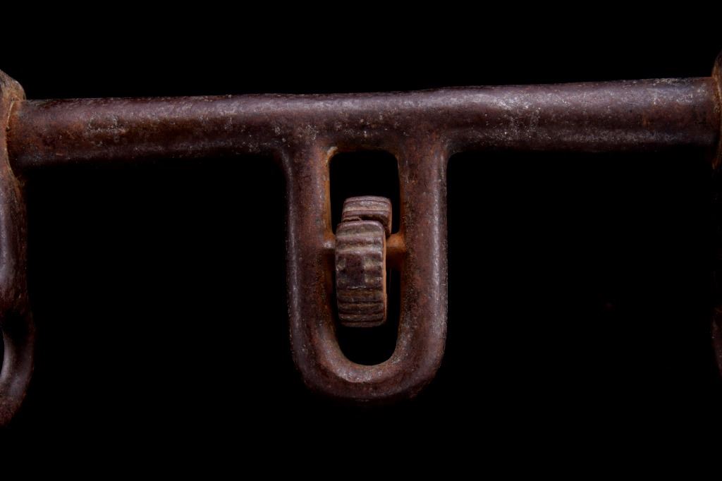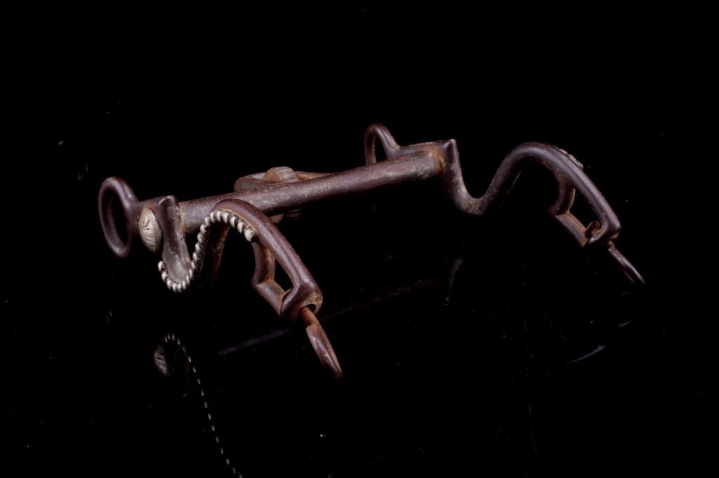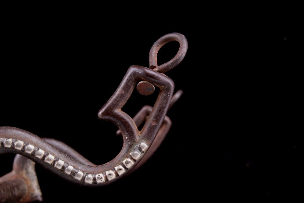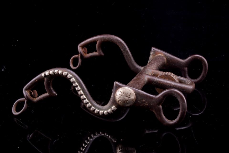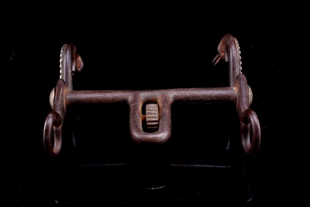 Featured in this lot is this North & Judd silver mounted high port bridle bit, circa 1920's. The bit shows a high port with a cricket in the center, a unique silver mounted "S" shank design with slobber strap connectors, and a wonderful silver mounted button at the top of the shank of the bit. North and Judd was a very large company based in Connecticut that produced saddlery and other hardware, from bells to buckles. The firm employed hundreds of workers and eventually would buy out the Buermann Company in 1926. This is why you will often see many Buermann patterns with the North & Judd Anchor Brand, as many popular Buermann patterns continued to be sold after North and Judd acquired them. The North and Judd stamp on these pieces dates them to after 1926; they are less valuable than similar Buermann pieces. The condition of this bridle bit is good, with oxidation and patina consistent with the age of bit. The measurements of this bridle bit are 6 1/4" x 6" x 1 1/2".