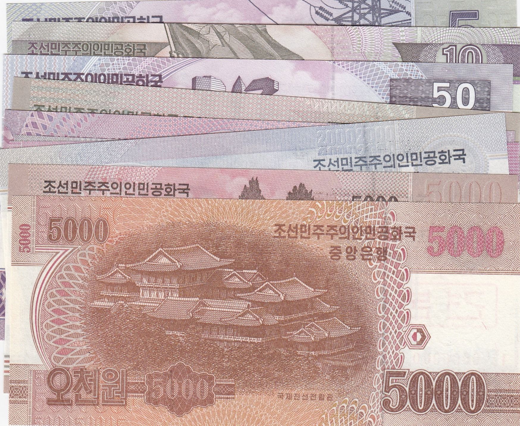 North Korea, 5 Won, 10 Won, 50 Won, 100 Won, 200 Won, 500 Won, 1.000 Won and 2.000 Won, 5.000 Won(2