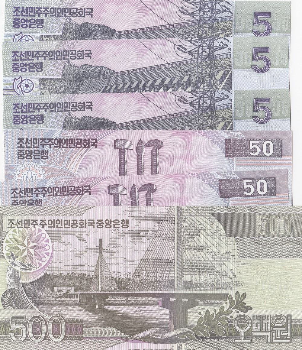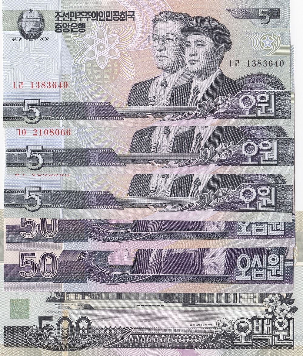 North Korea, 5 Won (3), 50 Won (2) and 500 Won, 2002/2007, UNC, p58, p60, (Total 6 banknot) br/