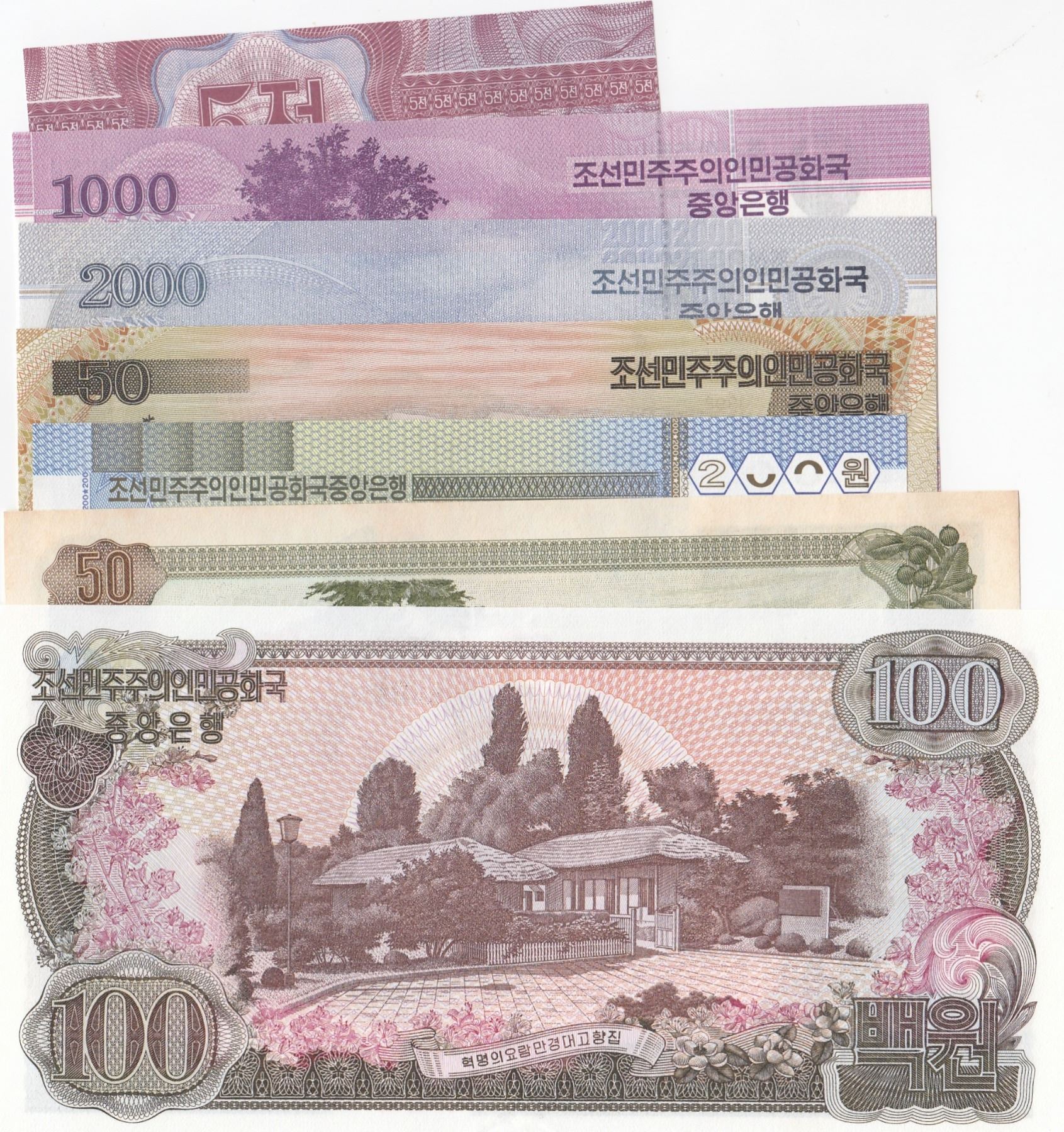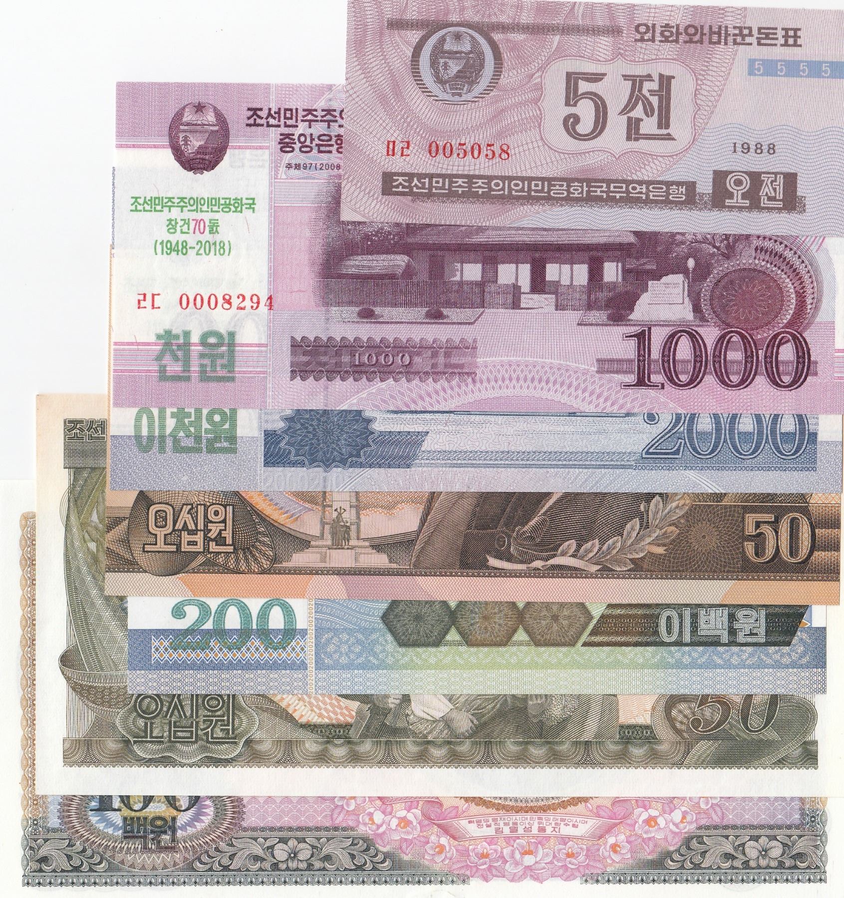 North Korea, 5 Won, 50 Won (2), 100 Won, 200 Won, 1000 Won and 2000 Won, 1978/2008, UNC, (Total 7 banknotes)br/