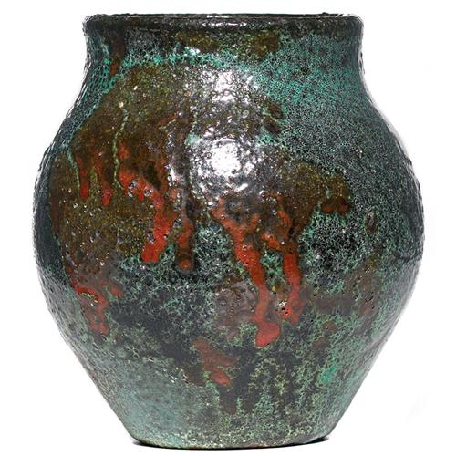 North State vase, swollen form covered in a textured green, black and brown glaze, impressed mark, 5.5"h, minor glaze flake to base