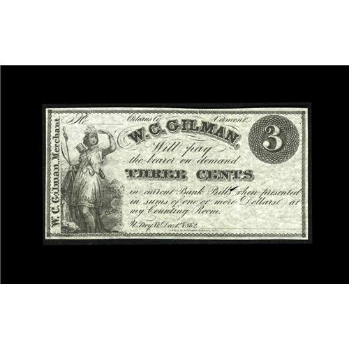 <B>North Troy, VT- W.C. Gilman</B></I> 3¢ Dec. 1, 1862 Coulter UNL<BR>A scarce note, with this denomination unlisted in the Coulter reference. <B>Extremely Fine.</B></I>