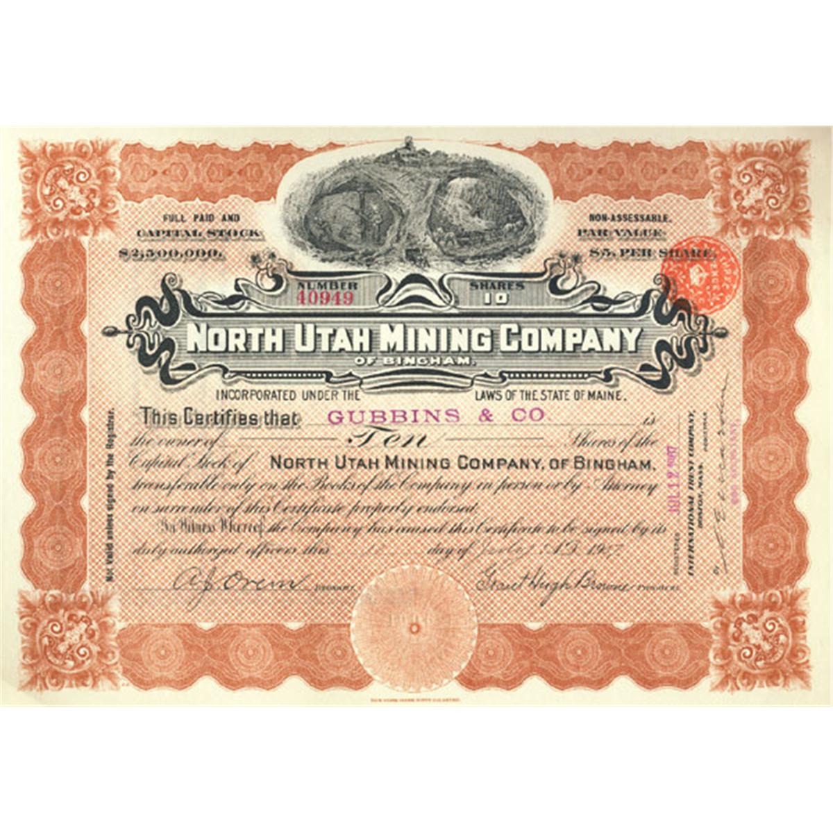 1907, Maine. Stock certificate for 10 shares. Brown/Black. Vignette of mining scene at top center. Uncancelled. Very fine.