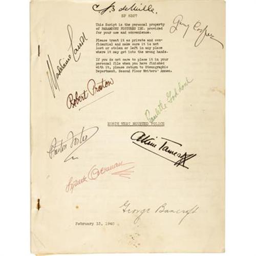 <B><I>North West Mounted Police</B></I></B></I> <B>Cast Signed Script.</B></I> A vintage copy of the 187-page screenplay for the Technicolor adventure epic, signed by director Cecil B. DeMille and stars Gary Cooper, Madeleine Carroll, Paulette Goddard, Robert Preston, Preston Foster, George Bancroft, Akim Tamiroff, and Lynne Overman. This is an unspecified draft dated February 13, 1940, with the actors' names written next to their characters on the cast pages in an unknown hand. This is a unique item boasting a great collection of autographs from the Golden Age of Hollywood. In Fine to Very Fine condition with mild wear and tanning; the blank cover page and the final page of the script (a story page) have separated from the staples, otherwise it is intact.<BR><BR><b>Shipping:</b> Books & Catalogs (<a target="_blank" href="http://www.heritageauctions.com/common/shipping.php">view shipping information</a>)