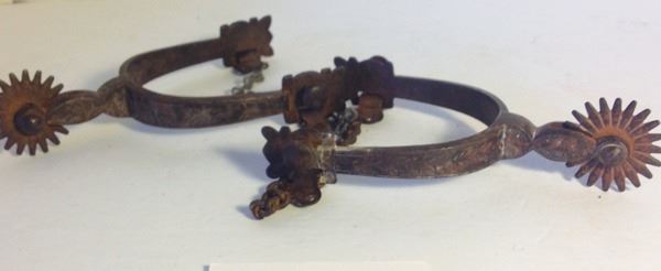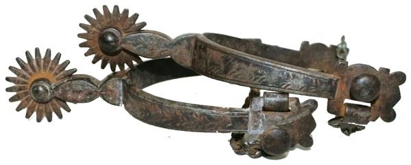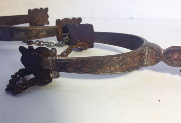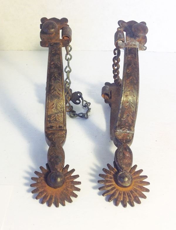 Finer pair of single mounded iron chased, anchor brand marked, iron spurs with anchor chains and 1-1/2" rowels. Good condition.Mid 1900sAdult