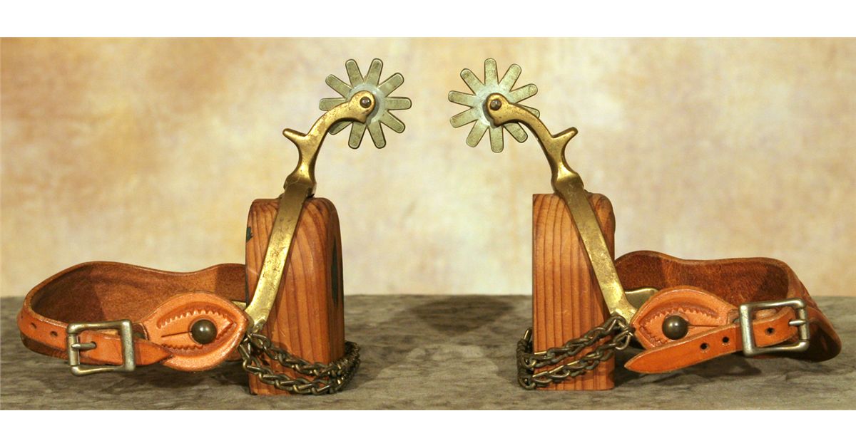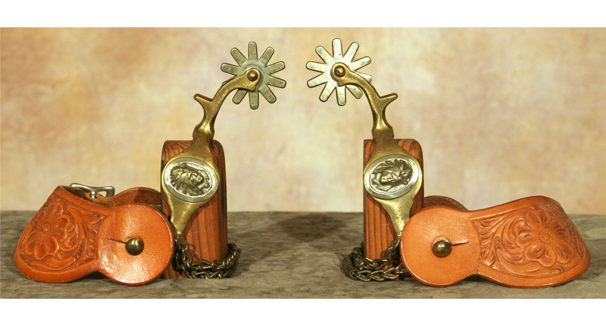 North and Judd Hercules Bronze Spurs. Indian chief pattern with chains. 1930s. Original straps.