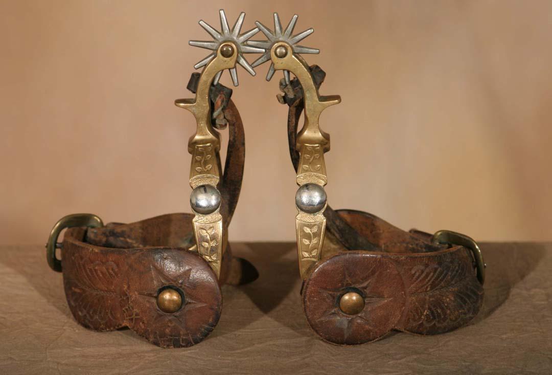 North & Judd Spurs. Single mounted & engraved, anchor marked. 1 ¾" ten point rowels. Old leather cowboy straps. Early 20th century. (est $400-500). For condition reports please visit: www.auctioninsantafe.com/cr2011.pdf