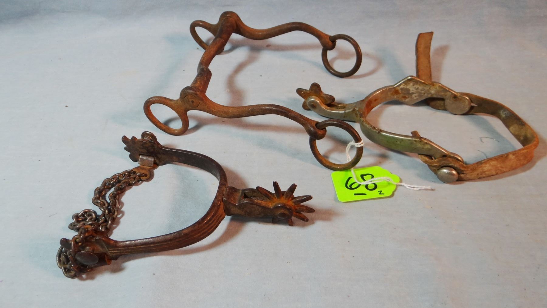 North and Judd single spur; Iron pony bit, original & August Buermann single spur with chains