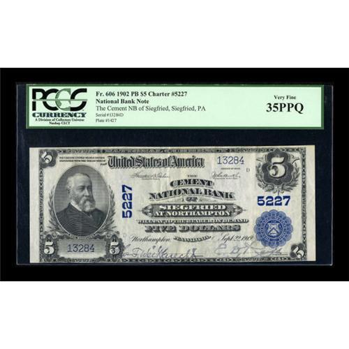 <B>Northampton, PA</B></I> - $5 1902 Plain Back Fr. 606 <B>The Cement NB of Siegfried</B></I> Ch. # 5227<BR> This bank had an interesting industrial title, with all of "Siegfried at Northampton " located inside the tombstone. The Northampton area is rich in limestone and is the hub of the Cement Belt. The stamped signatures are still bold on this Plain Back that has been by PCGS as <B>Very Fine 35PPQ.</B></I><BR><BR><b>Shipping:</b> Coins & Currency (<a target="_blank" href="http://www.heritageauctions.com/common/shipping.php">view shipping information</a>)