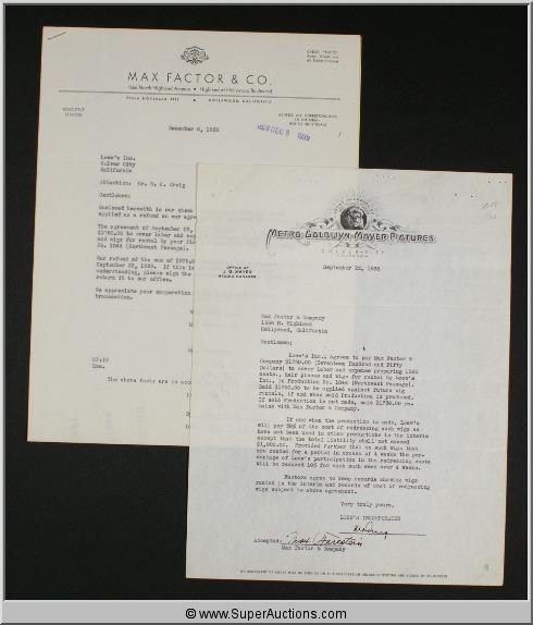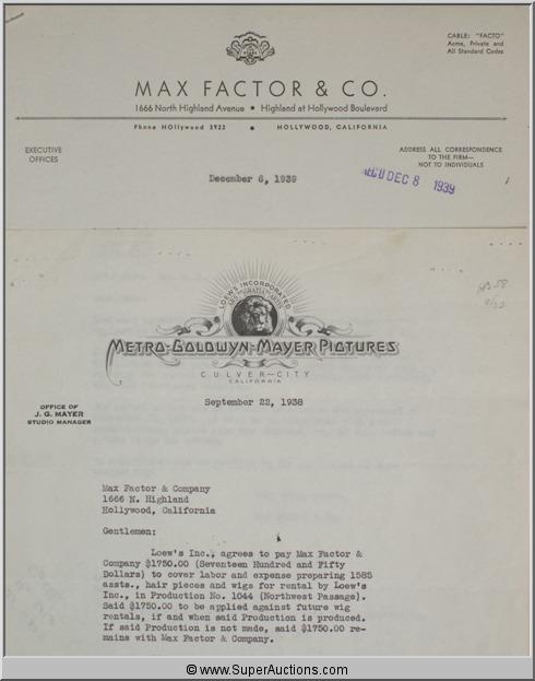 "Northwest Passage" / Released February 23, 1940 / MGM Pictures / "Langdon Towne and Hunk Mariner join Major Rodgers' Rangers as they wipe out an Indian village" / Starring: Spencer Tracy, Robert Young, Ruth Hussey, Walter Brennan and Nat Pendleton / Letter from MGM Pictures to Max Factor & Co. dated September 22, 1938 agreeing to wig rental, Refund letter from Max Firestein of Max Factor & Co. dated December 6, 1939 {Max Factor Collection}
