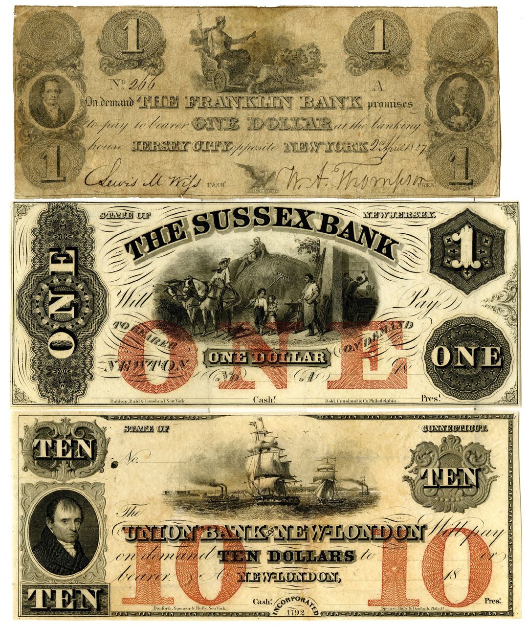 Lot of 3 notes, Includes Jersey City, NJ. Franklin Bank, 1827 Issued $1 banknote, S/N 266, VG, toning; Newton, NJ., 1850's, $1, Remainder banknote, AU-Uncirculated, BB and New London, CT., $10, Remainder banknote, Uncirculated condition, DSH-SH&D. (3)