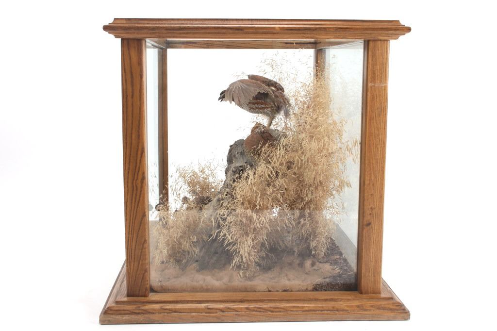 Featured in this lot we have a Montana taxidermy Northern Bobwhite wildlife scene and glass display case. The piece displays three Northern Bobwhite, two female and one male. The birds are set on and around a section of drift wood and surrounded with grass shoots. The ground shows a rich red clay with deer tracks across the bottom. The scene is set into a oak and glass display case and shows good condition overall. The case measures 24" long by 30" wide and 23 1/4" tall.