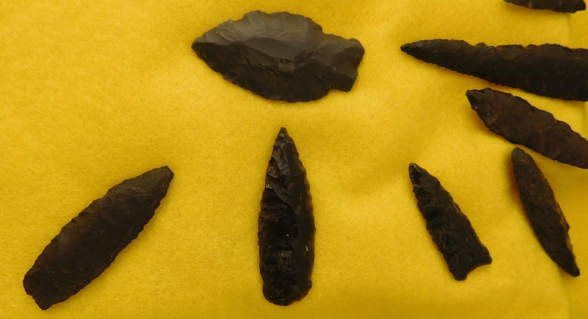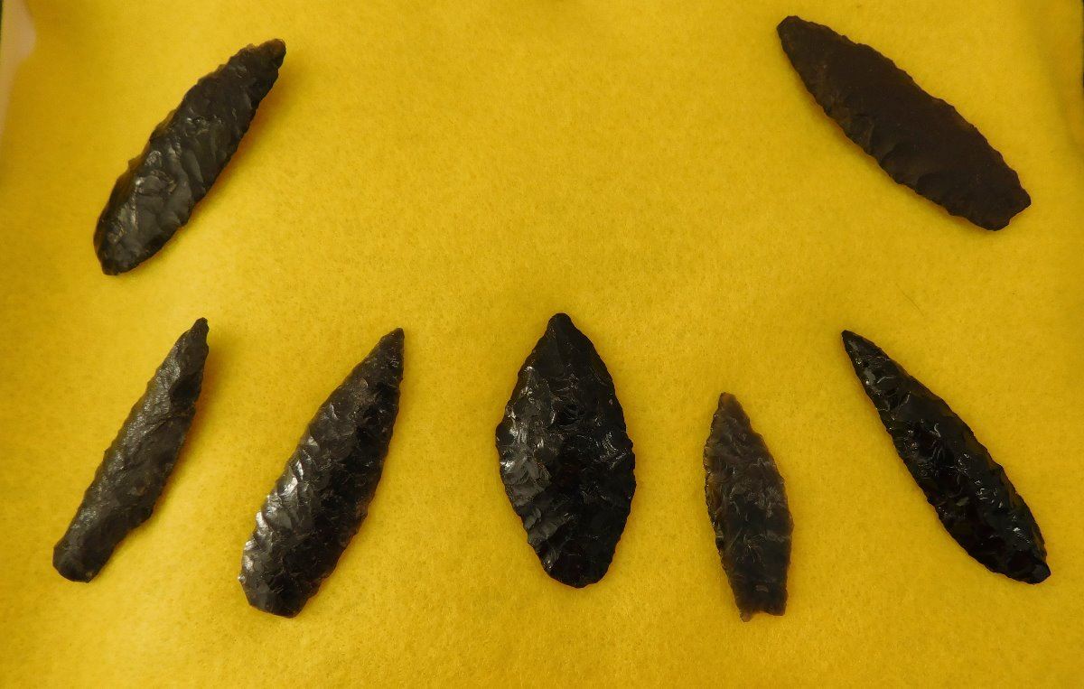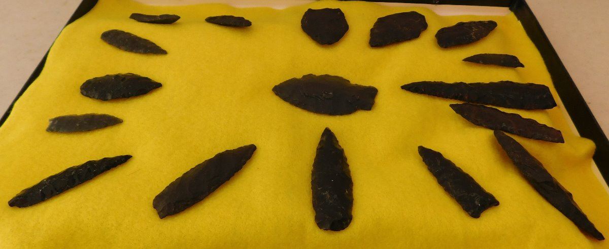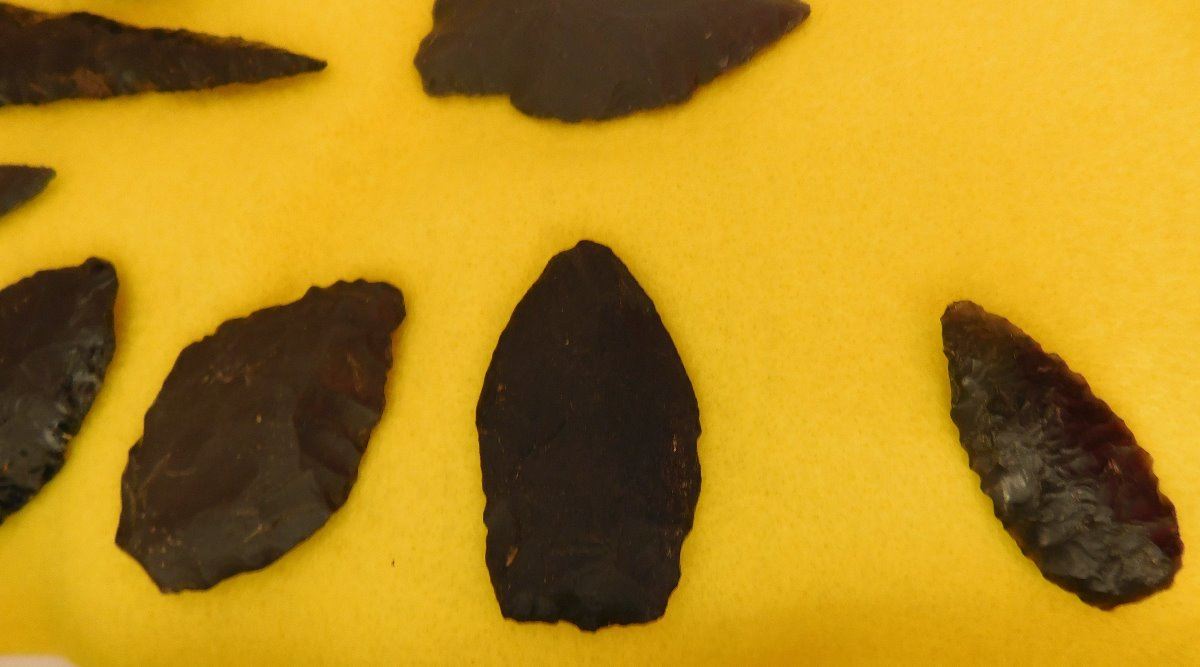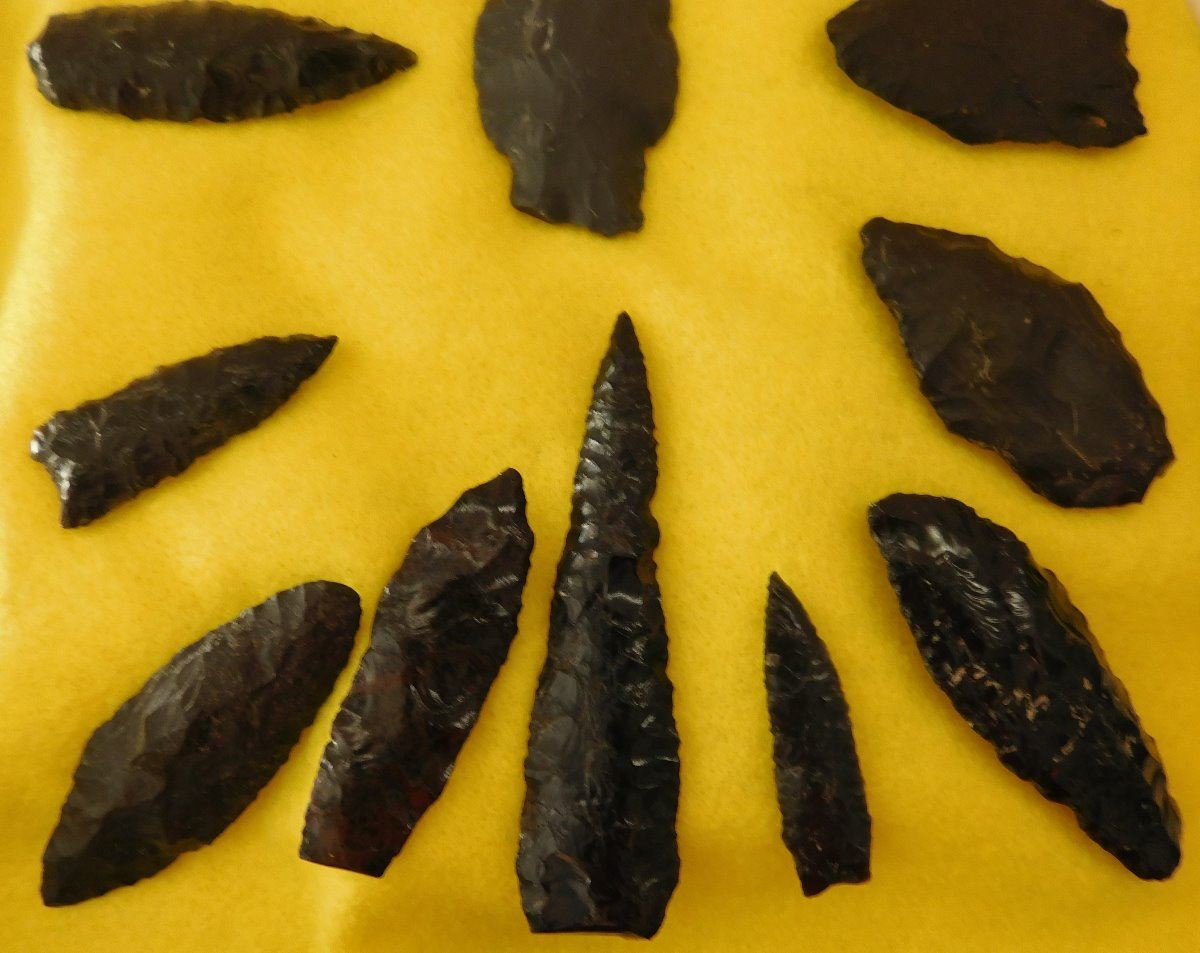 Northern California Obsidian Points, pre-historic items. Made of obsidian and black chert, the items range from 1" to 2". Humboldt County, California. Many types of points. Frame not included. Condition: As found, see images. Shipping: $20.50 w/insurance and signature.