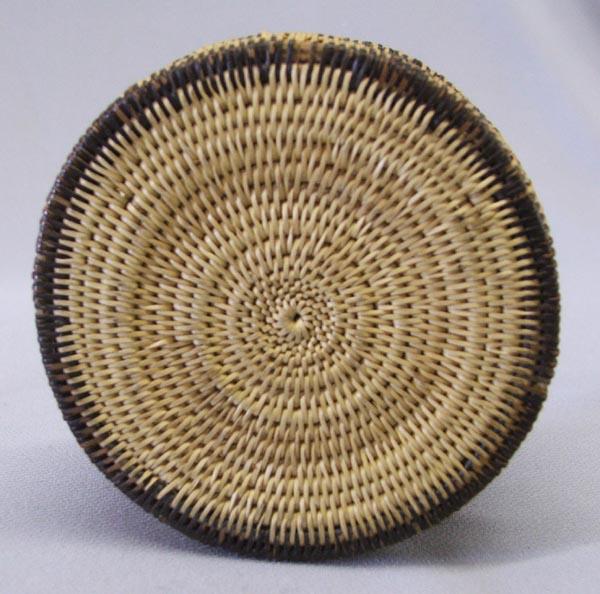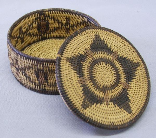 Northern California Tri-Color Lidded Woven Basket. Fine weave basket is 3-1/8'' diameter and 1.5'' high. SHI $20.