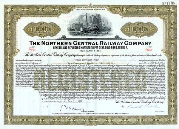 1973, Pennsylvania. $10,000 bond bearing 5% interest. Olive/Black. Vignette of train and ship at top center. A few pin holes. Lightly punch cancelled and Fine.
