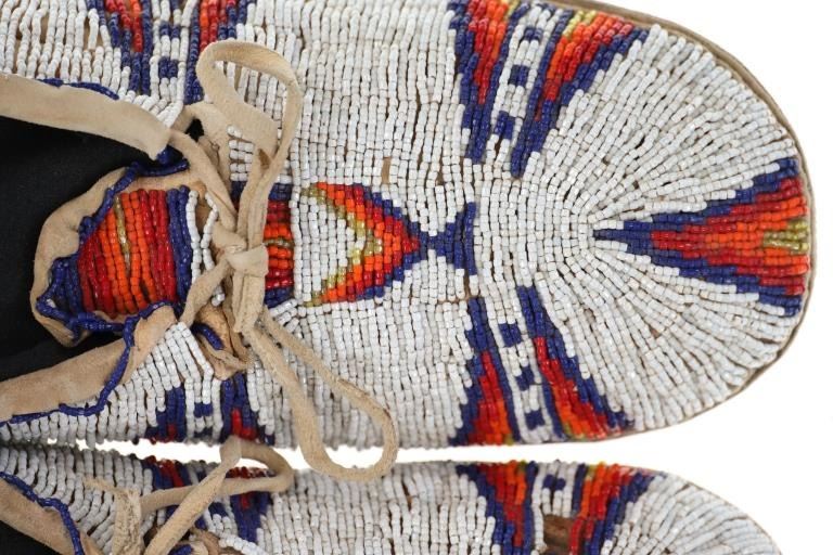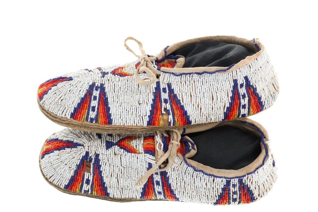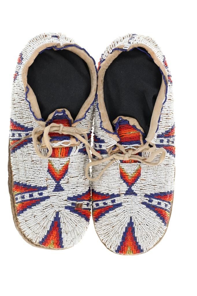 The lot features a large set of men’s moccasins from the Northern Cheyenne with beautiful beadwork. The set shows thick leather soles with foot worn pattern with thick hide tops covered in glass bead beadwork in a classic Northern Plains geometric pattern. The bottoms have older repairs and there is some very slight bead loss with glued repairs. The ankle top and tongue have a beaded edge and the beadwork has a nice appearance. From a large Indiana Native American collection. Each measures 11.5”L by 4.5”W by 3.5”H.