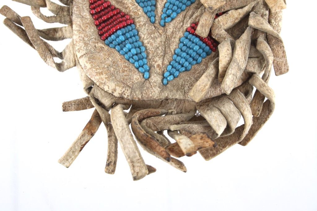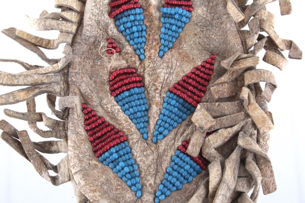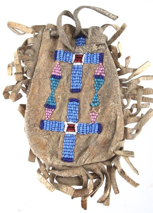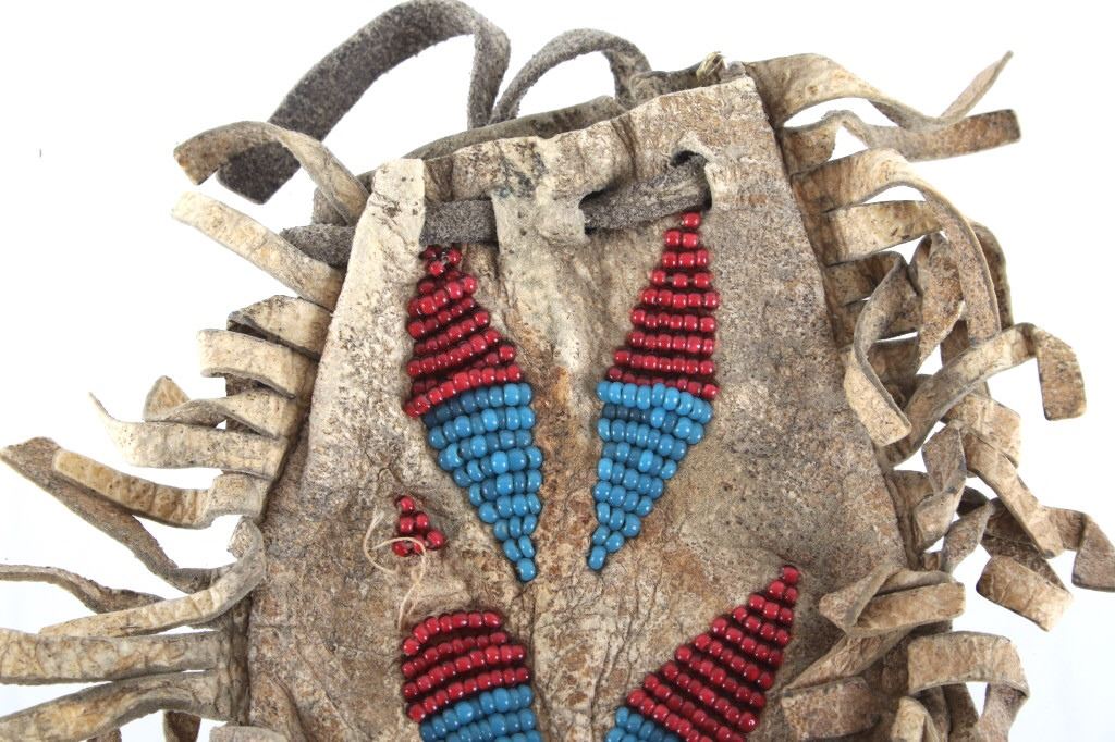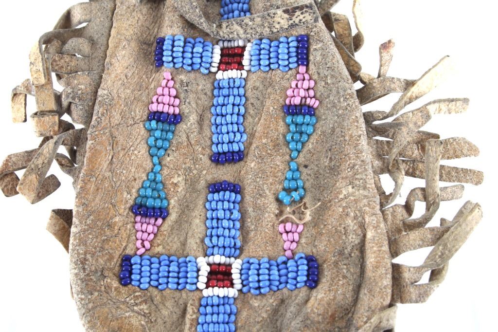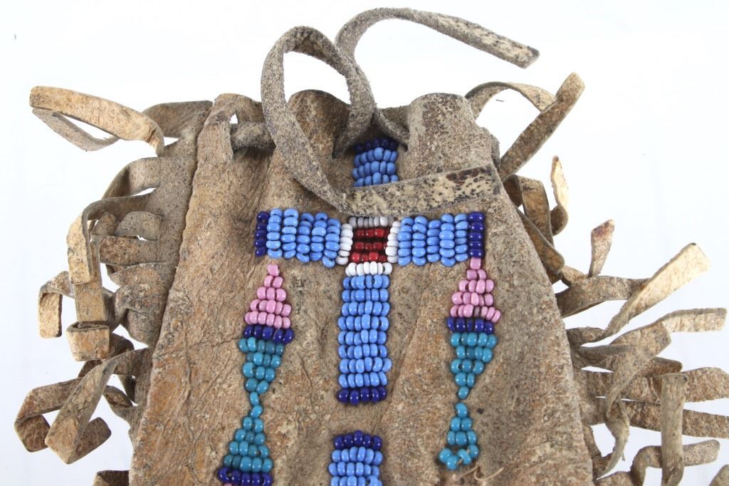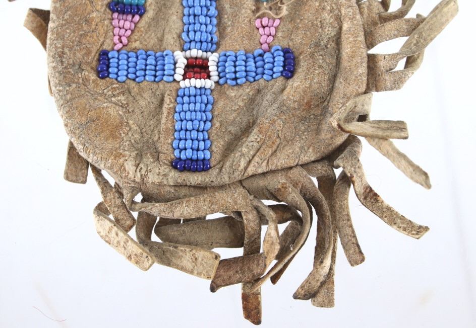 The lot features a beaded medicine pouch hide flat bag from the Northern Cheyenne Native Americans, dating to circa 1890’s. The piece is comprised of Indian tanned hide, which is trade thread sewn with a fancy hand cut Indian tanned hide fringed border framing the entire bag and further accented by geometric effigy beadwork, all in period correct glass trade seed cen beads. The beadwork shows two four-point Maltese-like crosses with diamond hour-glass-like symbols on one side and diamond arrow or track-like symbols on the other. The bead colors are red white hearts, greasy blue, cobalt, chalk white, Cheyenne pink, and medium blue. The bag shows the original Indian tanned hide draw string and the inside of the bag has remnants of what appears to be sage, signs of medicine shaman use. The piece has a nice worn patina from honest age and use and slightly stiffening fringes and supple hide. The bag has very slight bead loss. Provenance: From a private museum collection in the Auvergne-Rhone-Alpes region of France. The bag measures 3" x 4.25”.