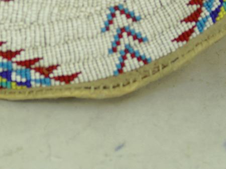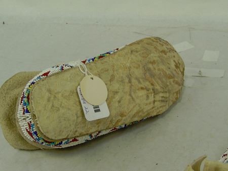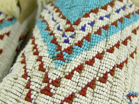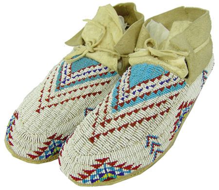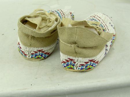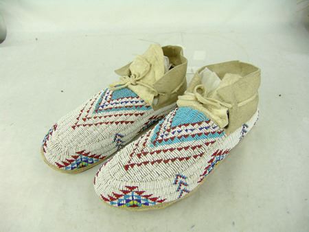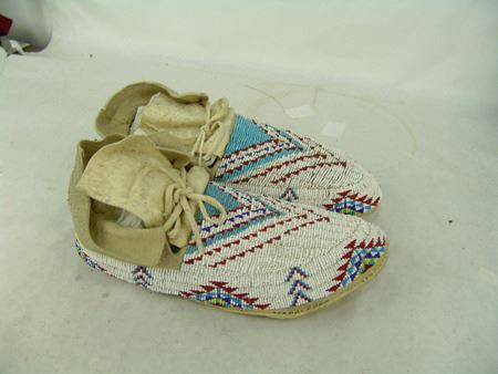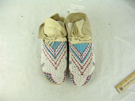 Early/Mid 1900s, Finer pair of sinew sewn and lazy stitch beaded moccasins with hard soles and stepped chevron pattern on vamps. Very good condition. 10-1/2"