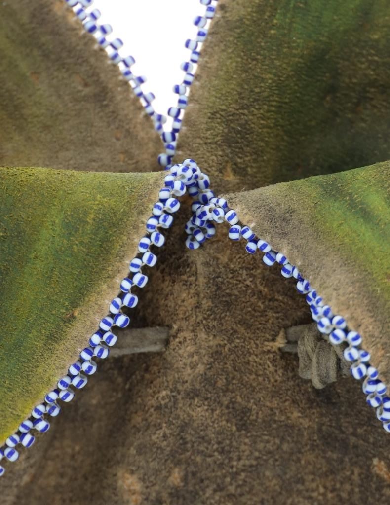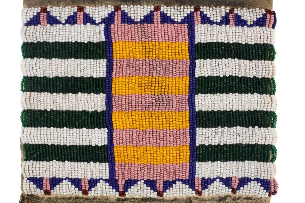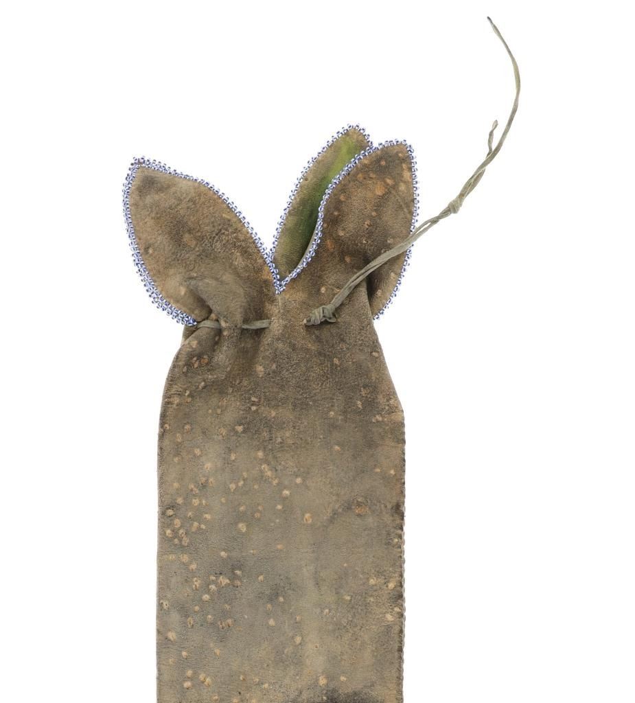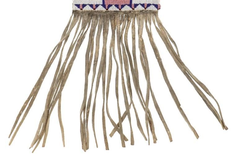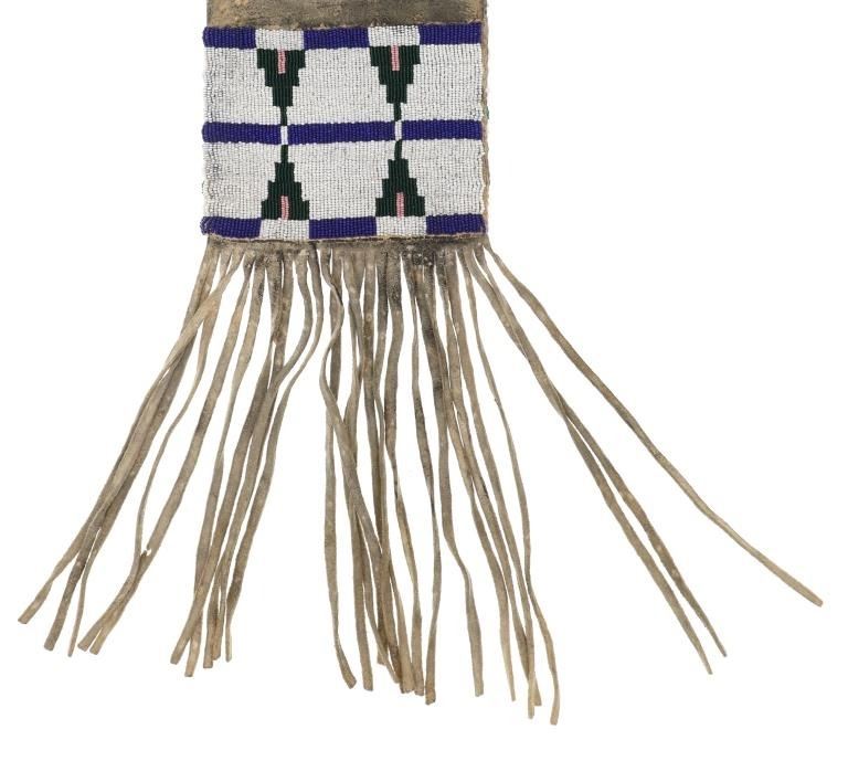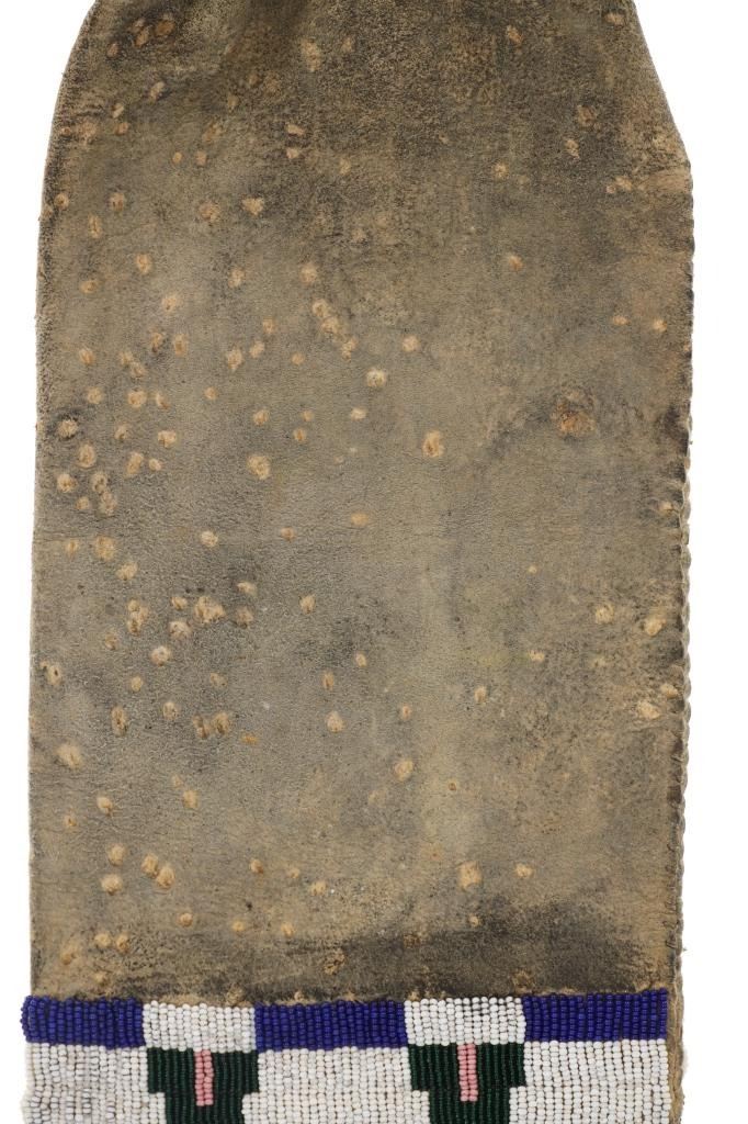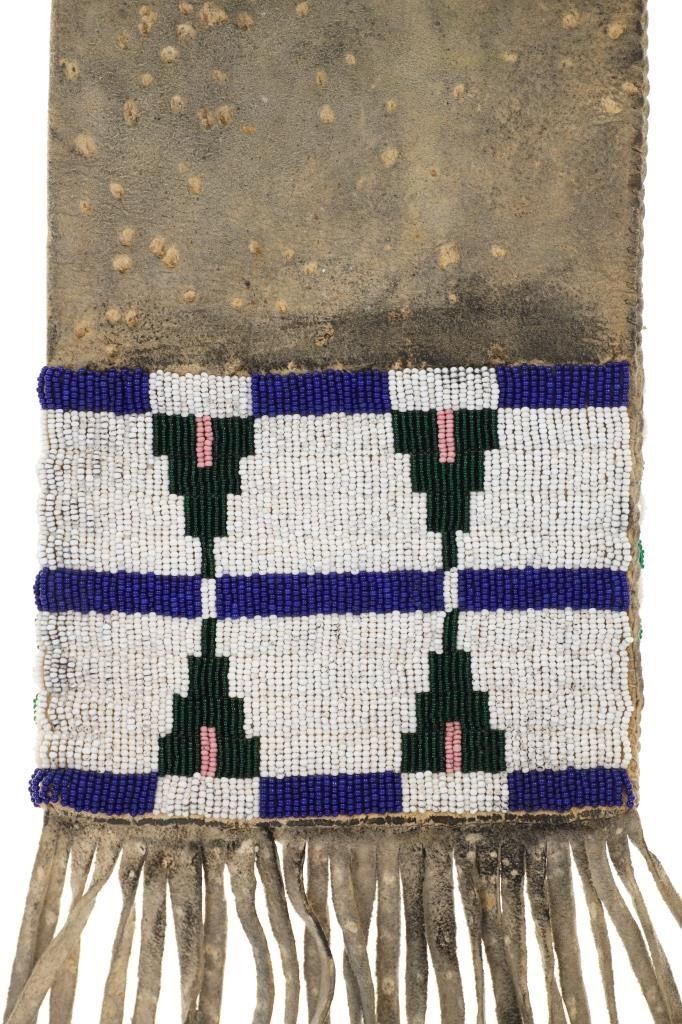 The lot features a fantastic four-tab beaded large pipe bag in Northern Cheyenne pattern. The bag is comprised of thick Indian tanned hide with a large section of beadwork that wraps aroud both sides, below being thick Indian tanned fringes. The body of the sheath has a spotted and dark coloring and at the top the iconic four-tab flaps with green and black coloring and fancy beaded edge with Venetian style glass trade beads that are striped in blue and white. The bag has an Indian tanned hide tie. From an Indianapolis collection. Measures overall 31"L by 9"W.