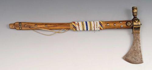 Northern Cheyenne Pipe Tomahawk. 19" haft. Tacked and beaded. Brass and iron head. 19th Century. Fine condition. (est $4,500-6,500)