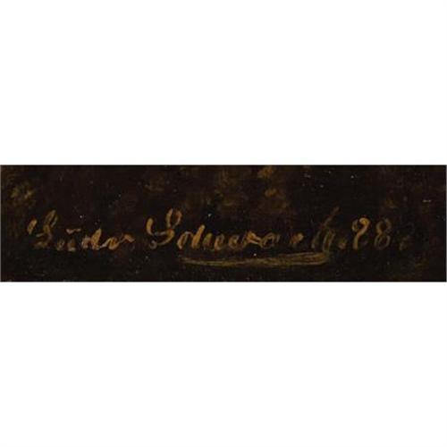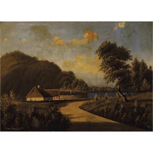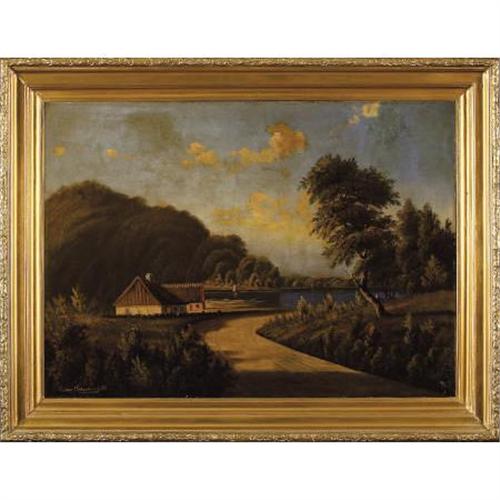 <B>NORTHERN EUROPEAN SCHOOL (19th Century)</B></I><BR><I>A Late Afternoon View of a Rustic Dwelling on a Lake</B></I>, 1888<BR>Oil on canvas<BR>25-1/2 x 36 inches (64.8 x 91.4 cm)<BR>Signed and dated lower left:<I> Ludv Eduvarts (?) 88</B></I><BR> <BR>This luminous painting captures the strong, late afternoon light in a fashion that suggests that it may have been done in Northern Europe, possibly Russia, Germany, or Scandinavia.<B>Condition Report:</B> Original stretcher, rustic relining, discolored varnish, 5 inch veritcal and 3 inch horizontal repairs in sky.<BR><BR><b>Shipping:</b> Framed - without Glass, Large (<a target="_blank" href="http://www.heritageauctions.com/common/shipping.php">view shipping information</a>)