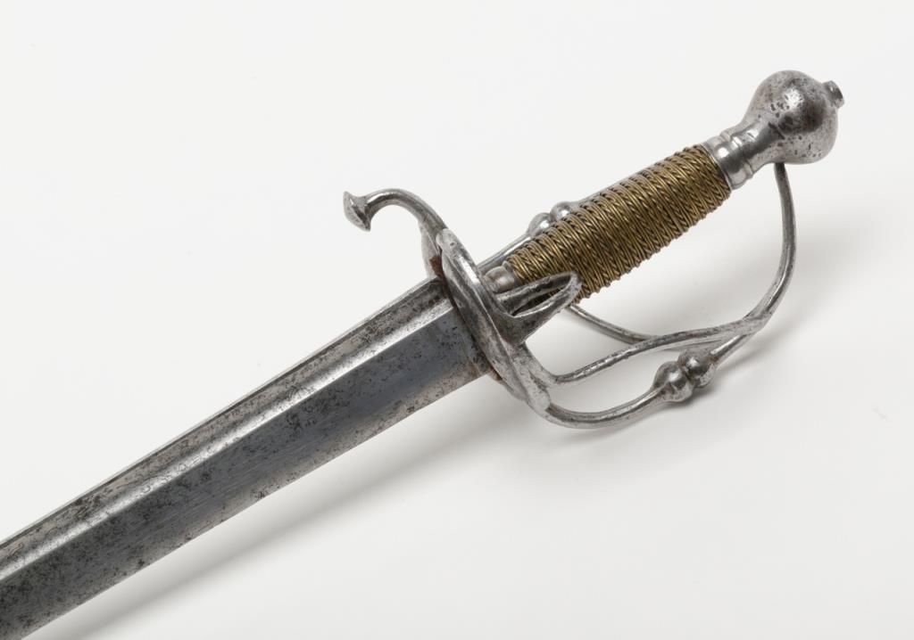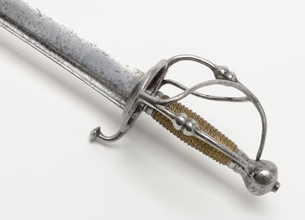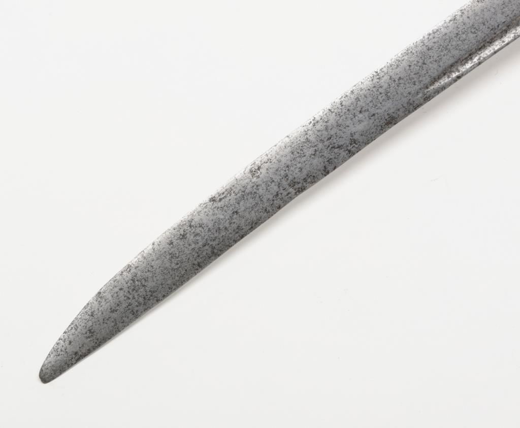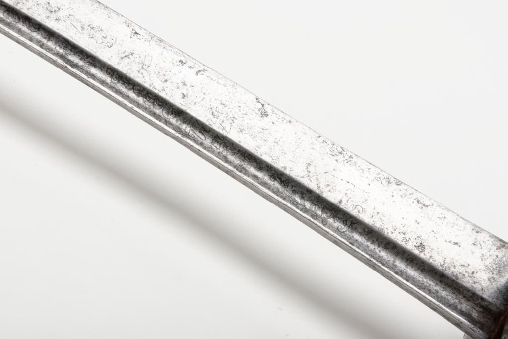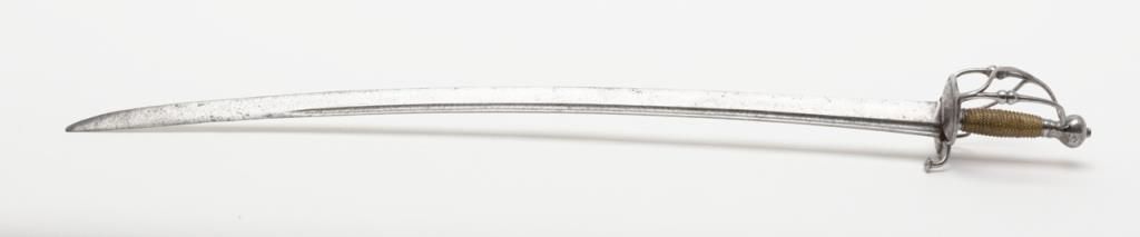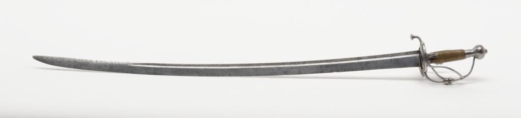 Northern European semi-basket hilt broadsword for Cavalry showing thumb loop circa about 1670-1690. The sword measures nearly 41” overall with 34” blade which is nearly 1 ½” across the widest part. The metal surfaces are all lightly cleaned andshow good period forging and metal work. The grip is brass wire over brass wrapped and probably a professionally done older restoration. The condition is good for its age. Est.: $1400-$2800