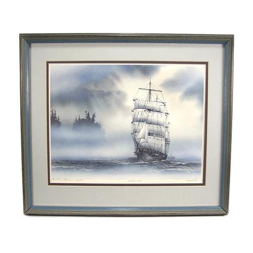 The early morning fog rises slowly as this square-rigged vessel moves carefully through northern coastal waters. Like a ship in a dream, such scenes remain only a memory.